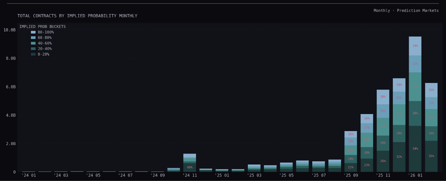 Kalshi 按隐含概率分布的月度交易量: