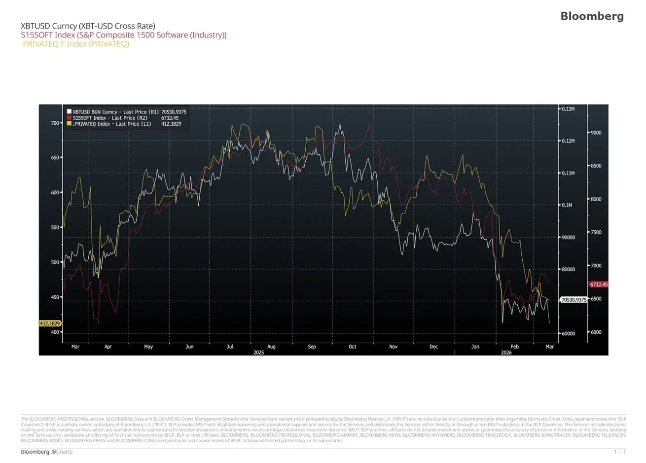 围绕软件估值与私人信贷的所有讨论,最终都会指向比特币。对比比特币与软件股、私募股权股票的走势叠加图,关联一目了然: