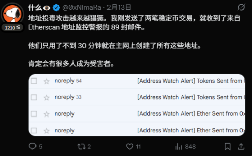 几周前,一位名为 Nima 的 Etherscan 用户分享了一次令人不快的经历。他在仅完成两笔稳定币转账后,短时间内收到了超过 89 封地址监控提醒邮件。