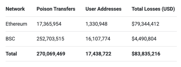 一项于 2025 年发布的研究,分析了 2022 年 7 月至 2024 年 6 月期间(即 Fusaka 升级前)的地址投毒活动。该研究显示,以太坊上共发生约 1700 万次投毒尝试,涉及约 130 万用户,已确认造成的损失至少达 7930 万美元。