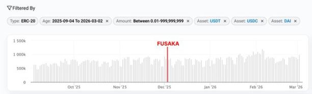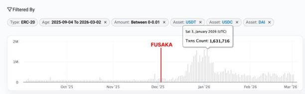 图表:Fusaka 升级前后 90 天内 USDT、USDC 和 DAI 的普通转账(>0.01 美元)趋势对比。(来源)