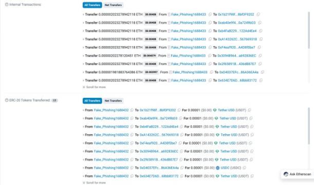 图示:地址 Fake_Phishing1688433 在一笔交易中向多个不同伪造地址批量发送代币和 ETH。(来源)