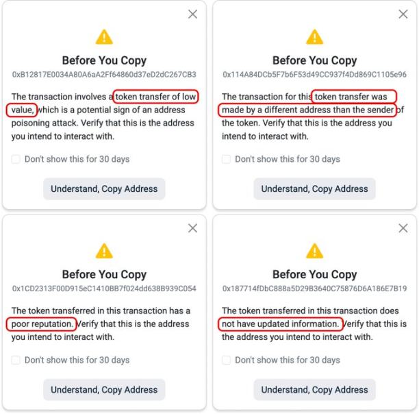 随着投毒攻击借助自动化和高量级粉尘转账手段不断升级,清晰呈现这些风险信号,对于帮助用户区分可疑活动与合法交易至关重要。