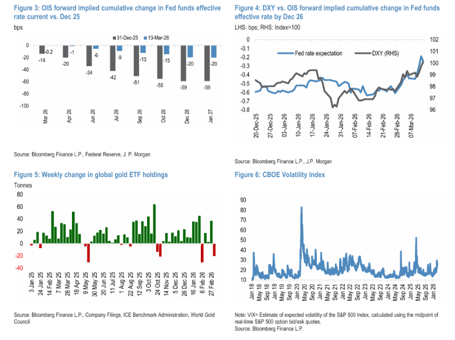 摩根大通指出,本轮黄金抛售由多重因素叠加驱动:能源价格飙升推高通胀预期,促使市场大幅压低对美联储降息的预期,叠加美元急速反弹,形成近期的直接利空背景。然而,该行认为最主要的推手是股市波动加剧引发的广泛去风险化——当 VIX 指数高企并持续攀升时,投资者在保证金追缴、组合再平衡和 VaR 冲击的叠加压力下被迫全面筹措流动性,黄金持仓首当其冲遭到抛售,全球黄金 ETF 持仓上周随之出现明显流出。