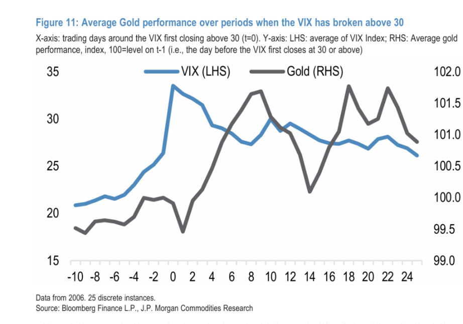 摩根大通的分析显示,黄金在市场压力初期遭到抛售,是一个有历史数据支撑的结构性规律。自 2006 年以来的周度数据表明,当 VIX 指数处于高位(30 及以上)且持续攀升时,黄金的平均周度回报率转为负值——这是所有 VIX 区间中唯一呈现这一特征的状态,同期金价上涨的概率仅为 45%。