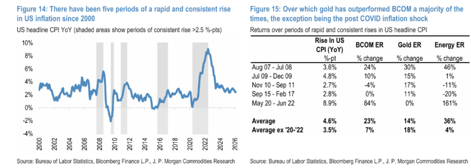 其一是通胀对冲价值。该行梳理了自 2000 年以来美国 CPI 快速持续上涨超过 2.5 个百分点的五个历史时期:除 2020 年至 2022 年疫情后通胀周期外,其余四个时期黄金均录得两位数涨幅,且均跑赢大宗商品综合指数(BCOM)。疫情后通胀系需求正向冲击与供应链受限叠加所致,大宗商品整体涨幅远超黄金,属特殊情形。摩根大通认为,若此次油价冲击演变为滞涨环境,黄金的通胀对冲价值将更加突出。
