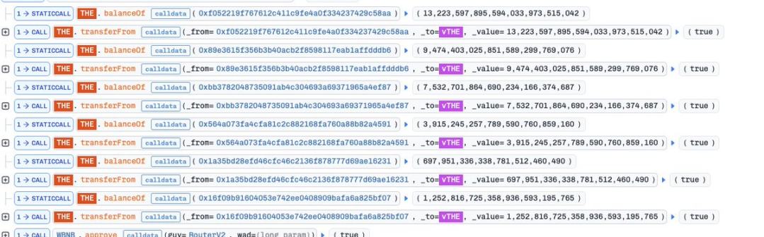 也就是在大量存入 THE 之后,直接向 vTHE 合约转账 THE,通过「捐赠」方式继续抬高可被系统识别的抵押价值,进一步突破上限。