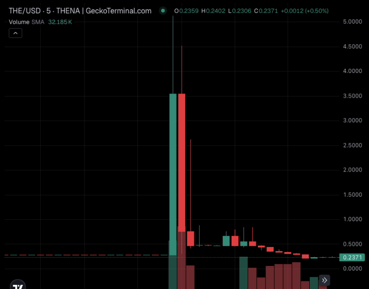 由于 THE 链上流动性极差,价格被从 $0.27 硬生生拉到 接近 $5。