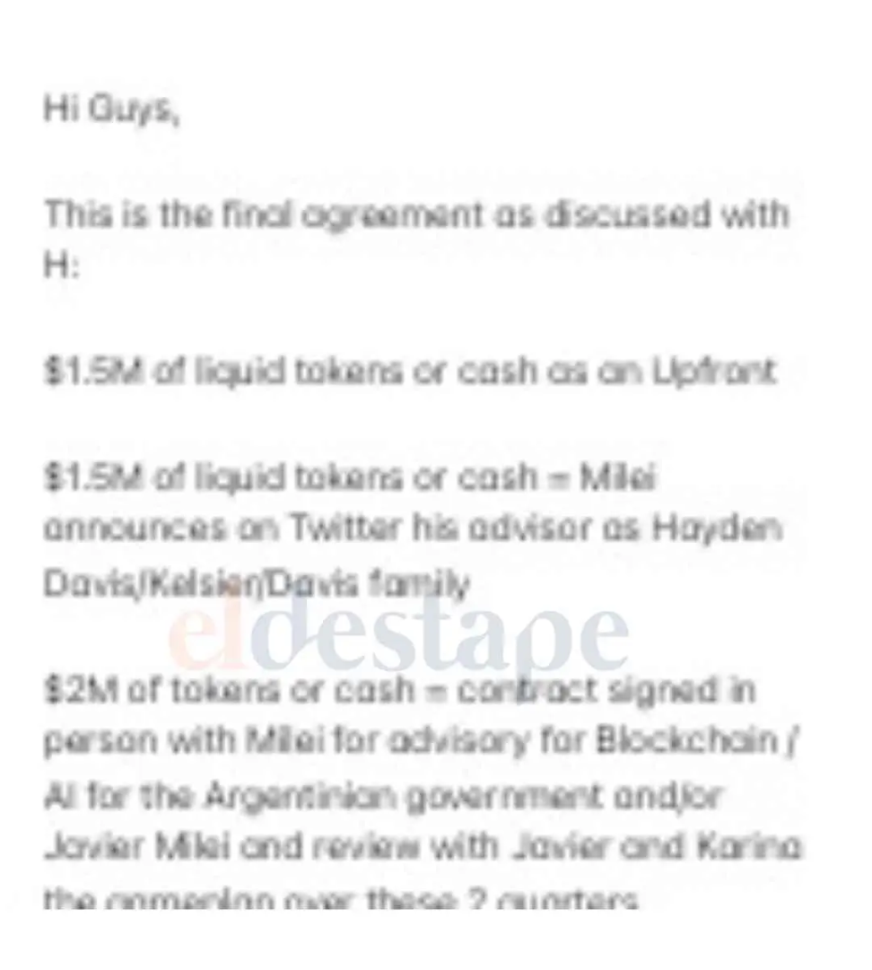 据报道,调查人员从被阿根廷总统办公室称为「KIP Protocol 的驻阿根廷代表」,实为一名加密货币说客 Mauricio Novelli 的手机中复原了 H(被证实为 Hayden Davis)与米莱达成的协议。