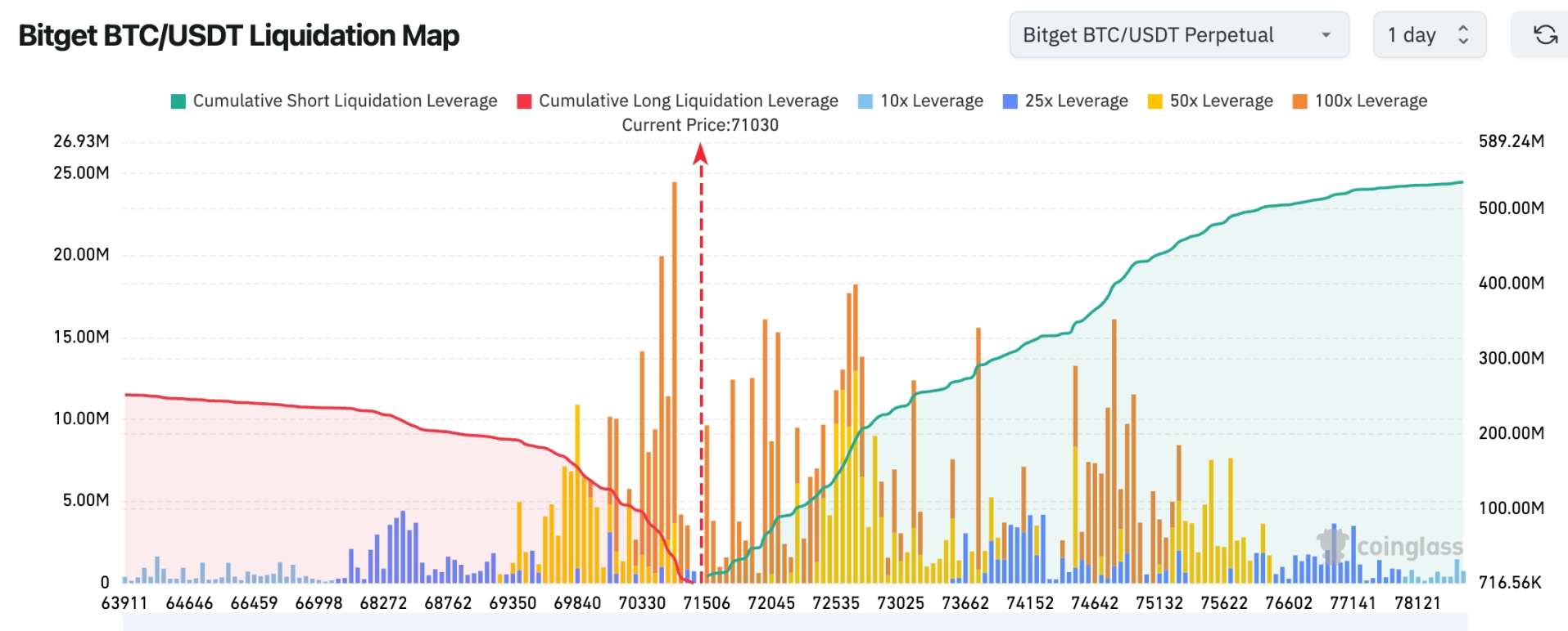 Bitget BTC/USDT 清算地图:当前价格约 71,000 美元,下方 70,000–71,500 美元区间存在明显多头清算密集区,若价格回落,可能触发多头连锁爆仓并放大下行波动。上方 72,500–75,000 美元聚集大量空头清算杠杆,若价格继续上行突破该区间,可能引发空头挤压并推动行情进一步上涨。