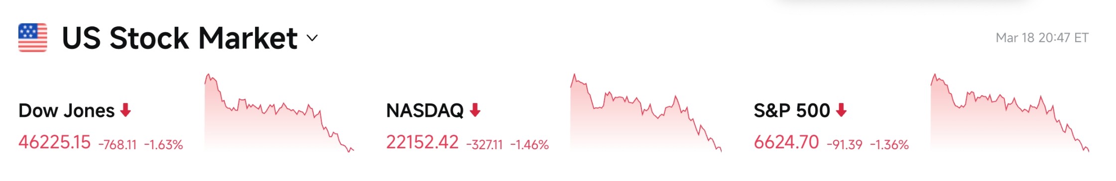 道指:跌 1.63%,报 46,225.15,结束连涨,防御板块未能抵挡整体抛压。