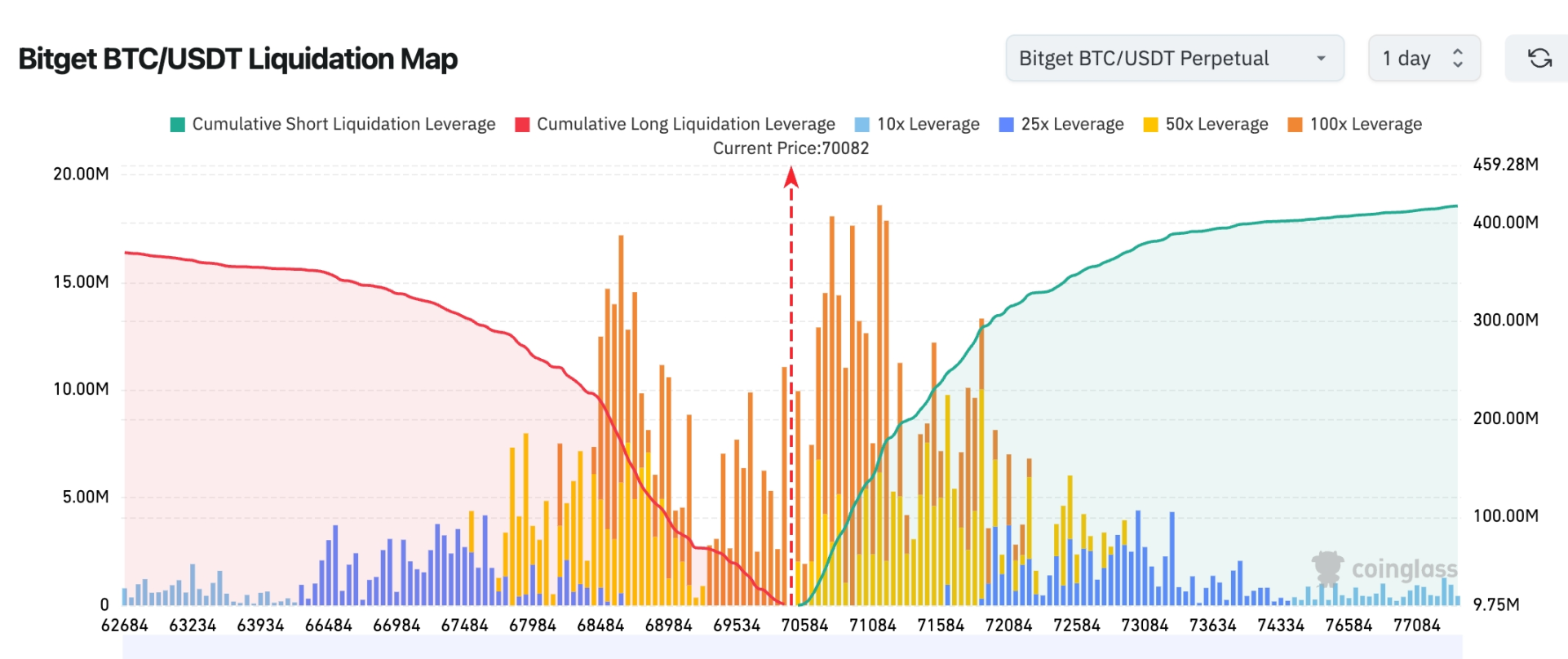 Bitget BTC/USDT 清算地图:当前价格约 70,000 美元,下方 69,000–70,500 美元区间存在明显多头清算密集区,若价格继续回落,可能触发多头连锁爆仓并放大下行波动。上方 71,000–73,000 美元聚集大量空头清算杠杆,若价格上行突破该区间,可能引发空头挤压并推动行情进一步上涨。