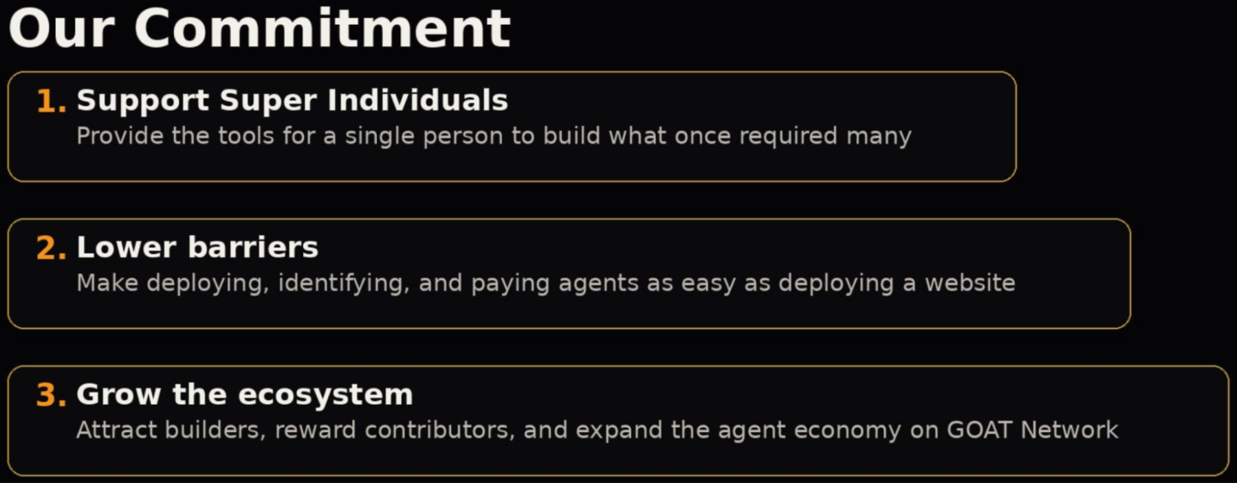 目前,我们已经完成了包括 GOAT L2(基于 BitVM2)、去中心化 Sequencer、ERC-8004、x402、AgentKit 与 ClawUp 在内的一整套基础设施。