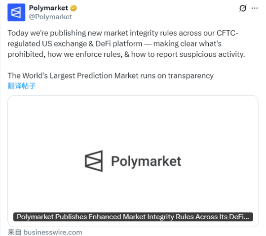 3 月 23 日,Polymarket 正式发布增强版市场诚信规则,覆盖其 DeFi 平台与 CFTC 监管的美国交易所,明确禁止内幕交易、市场操纵、抢先交易等行为,违规者或将面临永久封禁乃至执法介入。这是继去年 11 月向 CFTC 提交美国规则手册后,Polymarket 在合规路径上迈出的最新一步。