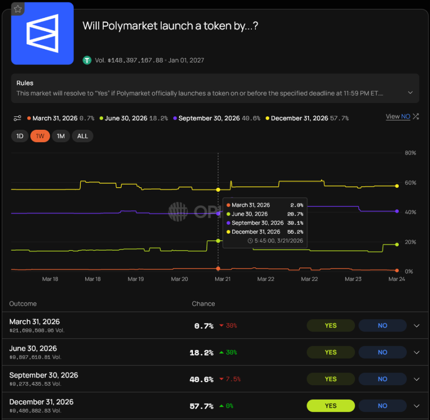 目前 Opinion 平台上「Will Polymarket launch a token by…?」市场的交易量已超 1.48 亿美元,市场预计代币在今年三季度前推出的概率约为 40.6%,年底前推出的概率为 57.7%。