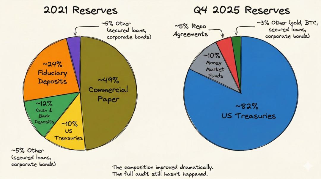 Tether 每季度发布由意大利 BDO 出具的储备鉴证报告,季度报告为有限保证,年末报告(2024、2025 四季度)为合理保证,核查更为严格。但两者均不等同于上市公司标准的完整财务审计。BDO 仅对 Tether 关于储备的陈述是否存在重大错报发表意见,不提供机构投资者通常要求的全套审计。