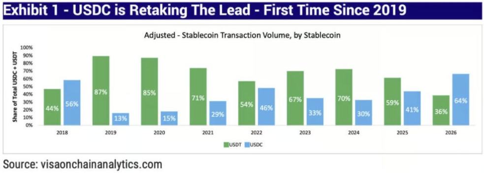 与 Circle 的竞争格局比双方表态更复杂。经调整交易量口径,USDC 自 2019 年以来首次反超 USDT。Visa 链上数据显示格局逆转:USDT 稳定币交易量占比从 2019 年 87% 降至 2026 年 36%;USDC 从 13% 升至 64%。