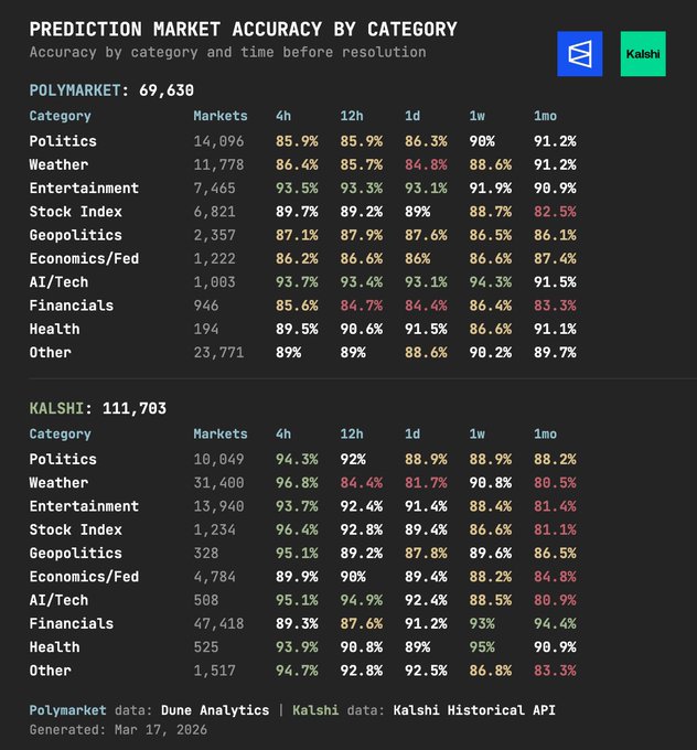 预测市场的真正秘密:娱乐比政治更靠谱。Kalshi的天气预测在最终4小时内从81.7%飙升至96.8%的准确率,但政治预测的跨平台差异却是最大的。这不仅关乎数据的精确性,更揭示了我们对未来事件的认知盲点。 娱乐市场的稳定性或许在提示我们,面对复杂多变的政治局势,依靠预测可能只是自欺。 https://t.co/XtcR2owLLS
