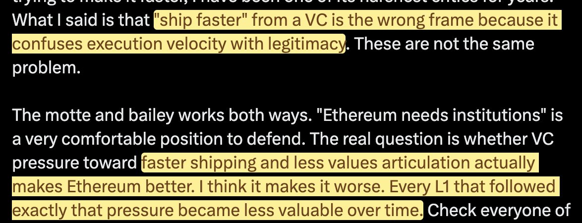 I'm not strawmanning you. These are your words. See the screenshot. Anyway no more point in debating this. You believe this is a harmless manifesto that is a timely restatement of what everyone already knows about Ethereum's credo. I believe it's not a harmless credo. Communications always mean more than it says on the tin—it represents an attempted regression to 2024 Infinite Garden drivel. That needs to be rebuffed, lest the EF backslide. And with Tomasz out from the EF, there are a lot of people internal to the EF who are very comfortable with a backslide, under the sense that the job is done, Ethereum is on more solid footing now, so everything is OK and they can go back to this. I think they cannot go back to this. The BD, the entrepreneurship support, the competitive pressure that—let's just say it—Solana shook Ethereum awake with in 2024, is at risk of being ceded. Go look at crypto startup incubators. How many of them are building on Ethereum mainnet? That number should go up. The more the EF decides that their mantle is to recede into the ivory tower and write flowery manifestos before becoming irrelevant, the more it cedes the ground to the other blockchains who will compete more aggressively for that talent and those startups. We all agree Ethereum is sanctuary technology—but is it just sanctuary technology? If so, there is no reason it should be worth hundreds of billions. There's no reason to hold onto all of its TVL. There's no reason why we should all hold ETH if that's all it is. If it's more than that—if it's an economy—then its economic heft needs to be stewarded and defended. Ethereum was a startup too. It raised money in an ICO and was also funded by private investors. It is easy to forget that now, as Ethereum feels like an institution. But it's not. Ethereum is not like Bitcoin. There's no guarantee that it will still be relevant in 10 years if it does not fight for it. And the EF, being funded to the tune of hundreds of millions of dollars, abstains from that responsibility at its own peril.