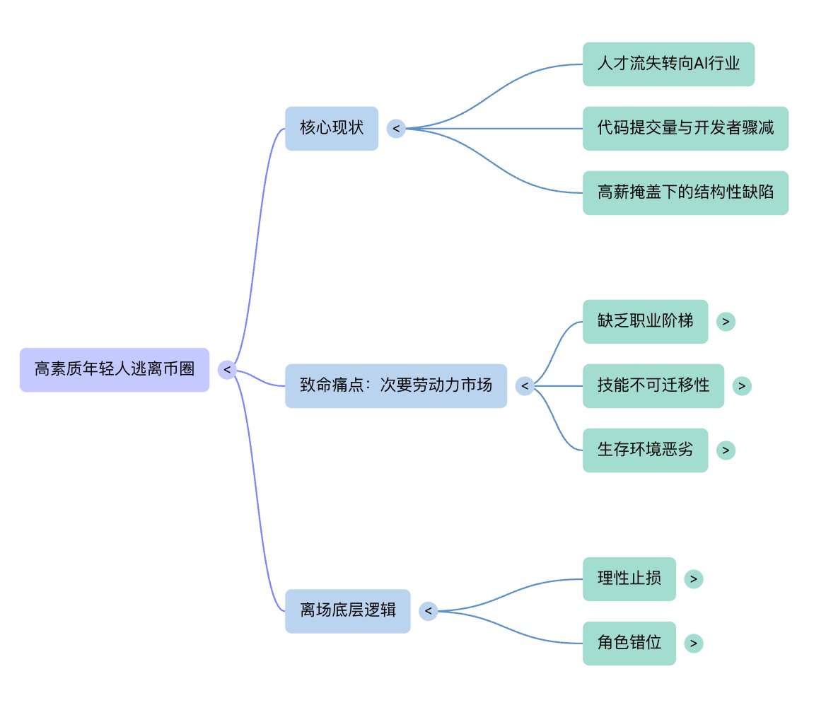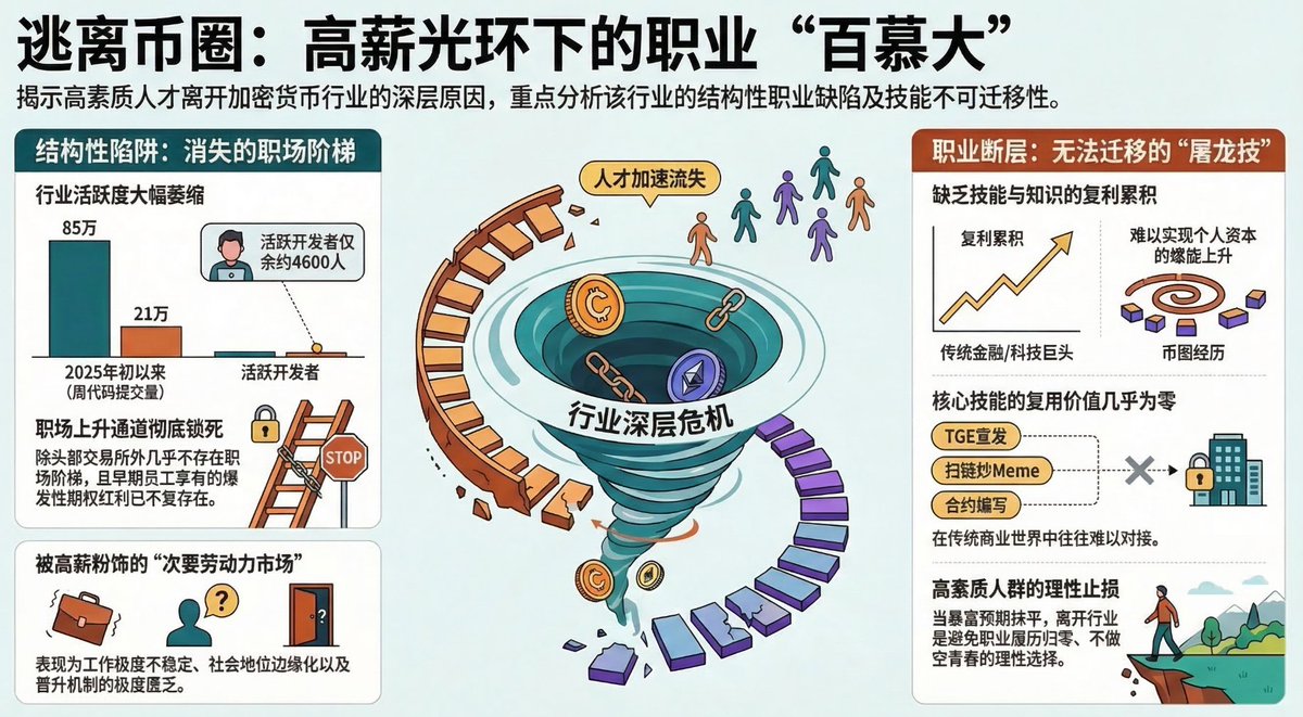 逃离币圈的高素质年轻人们:高薪伪装下的 “次要劳动力市场” 今天跟一个 Crypto 卡牌项目的员工聊,发现几周前他居然已经离职加入 AI 行业了。身边有不少相似的现象,这也是我最近观察到的一个很明显的趋势:不仅仅是那个 Multicoin 联创离开了,众多高素质、顶尖背景的同龄人才正在快速从 Crypto 行业流失 我并不认为这能简单归结为 “币价跌了”、“熊市难熬”,比起周期,我从我的视角来看,真正逼退这些聪明的同龄人的,是这个行业在职业生涯规划上极其致命的结构性缺陷,上升通道的彻底锁死 哪怕他们熬过了币圈的裁员,也不会留在币圈的原因可以用一句话概括:炒币自由不了,那日子总还要过吧 两个问题引出第三个问题: 1. 币圈的流动性来源于哪里?二级市场 2. 二级市场发生在哪里?交易所 3. 行业需要优质的年轻的人才加入吗? 第三个问题,应该无需长篇大论论证。至少仅仅从 GitHub 数据来看,自 2025 年初以来,加密项目周度代码提交量约从 85 万降至 21 万,活跃开发者降至约 4600 人 所以可以很明显发现,在现阶段的币圈,除了头部交易所,几乎不存在真正意义上的职场阶梯。但即便是把青春奉献给交易所,能熬过 2-3 年的人也寥寥无几。在这个阶段入场,既拿不到早期员工那种具有爆发力的期权,也早就失去了靠行业红利直接 “买断青春”、实现财富自由的机会(当然,不考虑某些老鼠仓小编和某位现已离职的某链运营哈) 用经济学家 Doeringer 和 Piore 提出的二元劳动力市场理论来拆解,一切就变得无比清晰:Crypto 行业的就业基本盘,本质上就是一个被高薪粉饰的【次要劳动力市场】 在传统的主要劳动力市场(如顶尖金融机构、科技巨头或成熟的咨询公司)里,雇主和员工之间存在一份长期的隐含合同,提供的不只是体面的薪水和社会地位,最核心的是知识与技能的复利累积。在那种环境里,职业发展呈现出一种螺旋上升的态势:个人资本(能力、人脉、认知)随着时间不断增值。一个行业专家,可以凭借过去几年积淀的核心技能,横向跨界跳槽到咨询行业看特定赛道,或者进入大企业的战投部 但在 Crypto 这个次要劳动力市场里,哪怕工资未必低,你依然要面对工作极度不稳定、社会地位边缘化,以及晋升机制的极度匮乏 这就引出了那个最致命的问题:从币圈出去,你还能跨界到哪儿?答案是残酷的:无路可退。 在 Crypto 行业积累的所谓 “专业技能”,无论是找 KOL 进行 TGE 的宣发、写智能合约、还是推特运营,或者扫链炒 meme,在传统商业世界里几乎毫无复用价值。技能的不可迁移性让币圈的从业经历更像是一道职场履历上的断层 在传统就业市场尚未完全被 AI 吞噬的今天,顶级年轻人才必然会算一笔长远发展的账。当暴富预期被抹平,剩下的只有无法复用的屠龙技和随时归零的职业履历时,高素质人群的加速离场是一种极其理性的止损 在这个高波动的黑暗森林里,如果不能蜕变成一个自负盈亏、绝对理性的超级个体(独立交易员或投资人),仅仅想作为一个打工人来出卖时间,那这无疑是对自己青春最大的做空,这也是那些优秀的同龄人不愿继续在 Crypto 从业的核心原因 行业领导者更应该重视人才流失的问题,与其选择什么是对的,不如先排除错误答案