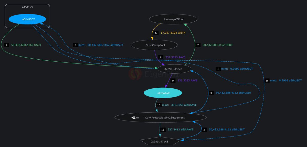 梳理了一下最近Aave上那笔5000万美金的交易事故。(通过CoW Swap) 虽然这是DeFi历史上最严重的交易执行损失,但发生的很诡异。 第一点是CoW的抗MEV几乎失效了。 按照目前AAVE的链上流动性,换回500万美金的AAVE肯定是没问题的,但最终执行被路由到了深度最差的Sushi pool,只有7万美金的流动性。 结果是花费5000万美金,只买到了3.6万美金的AAVE。 CoW在报告中披露了一些问题,比如这里有一个gas上限的bug,有solver给出了更好的报价,但被这个限制拦住了,这个问题后面进行了修复。但这笔交易事故已经无法挽回。 在执行阶段其实还有机会救场,Solver E在这个阶段找到了更好的报价,并且成功赢得了竞拍,但最终却没提交交易,而CoW的拍卖系统对于这种胜者获胜后没交付的情况,没有应急措施,或是惩罚机制,哪怕拒绝到这笔交易也行,都没有。最后漏给了非常差的solver接手。 第二点比较奇怪的是,单笔5000万美金这么大的交易,在非稳定币交换中,很少见。因为多数pool的流动性都支持不了,而且在协议已经提醒99%价格影响的情况下,用户还手动确认了交易。 第三点是CoW自己说这笔交易可能泄漏到了公开mempool,具体原因目前还没写清楚。 目前两个协议都发了事后报告,MEV bot获利990万美金,贿赂区块构建者3400万美金。 责任认定上很清晰主要在CoW,因为Aave只是前端集成了CoW组件,两个协议也没有推卸责任扯皮这些事,我觉得态度上都很好。 这次事件是buff叠满了,是多个系统问题叠加导致了一个比最差情况还要糟糕的结果。 对CoW来说应该还有很多问题需要查明。而目前这个交易执行者似乎还没露面,最初做这笔交易的动机也不得而知。