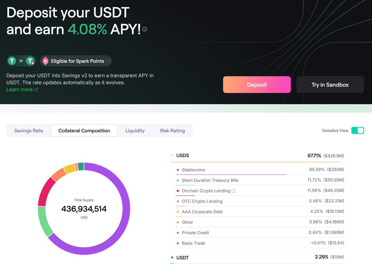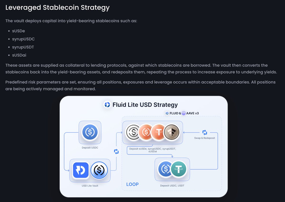Fluid开的这个USD Vault,据说固定利率6%,但是要loop ethena、maple、usdai这三个项目,风险收益已经完全不成正比了。而且usdai还有一部分是放贷给GPU的。 与其这样不如sky/spark的savings,USDT是4%收益,没有杠杆,追溯到MakerDAO时期也运营多年了。 以前usde pt有很多人去loop,是因为收益都是2位数以上。6%我觉得没人愿意承担循环贷风险。 Fluid说他们ETH Vault就是loop策略,且运行了4年,这个没错,也比较稳定,但ETH LSD结构简单,跟这些稳定币完全不一样。
